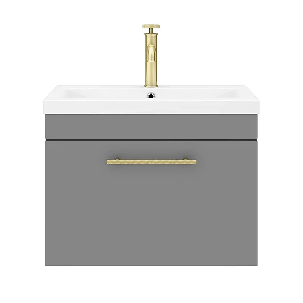 Arezzo Industrial Style 600 Matt Grey Wall Hung 1-Drawer Vanity Unit with Ceramic Mid-Edged Basin + Brushed Brass Knurled Round Pull Handle