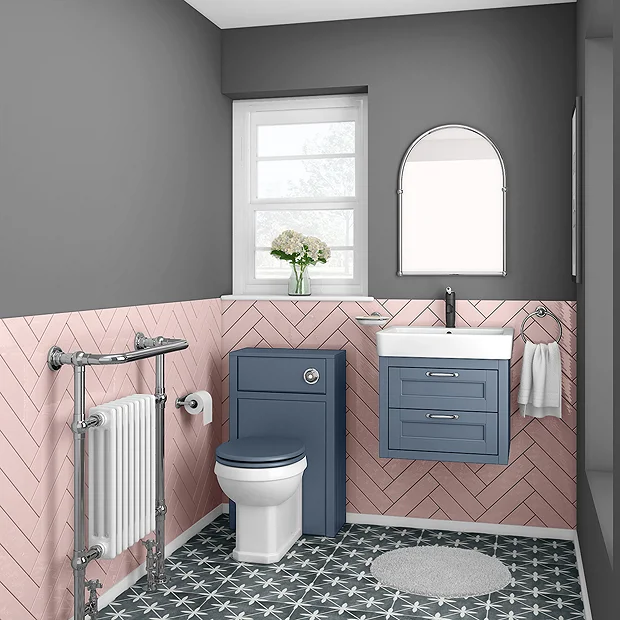 The Chatsworth traditional 500mm wide back to wall toilet unit, Victorian inspired design with a modern twist. The Chatsworth range of charming bathroom furniture features classic styling with a satin blue finish and tongue-and-groove side panelling. Manufactured to a high standard, the inspired Chatsworth range of luxury furniture with it’s clean minimalist design and muted palette blends beautifully with any style of bathroom.