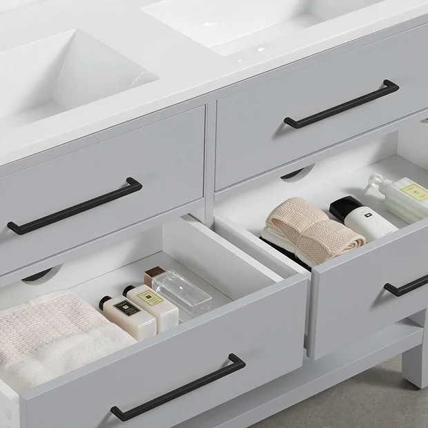 The satin dove grey finish and sleek design will turn your bathroom into an elegant, modern space. Create an effortless look and enjoy the convenience of having everything you need in one place. Coordinating mirrors are available to complete your bathroom interior.