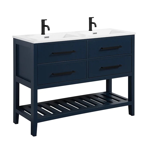 Montrose 1200mm Floor Standing Vanity Unit in Indigo Blue with Matt Black Handles, Slatted Shelf and Double Stone Resin Basin